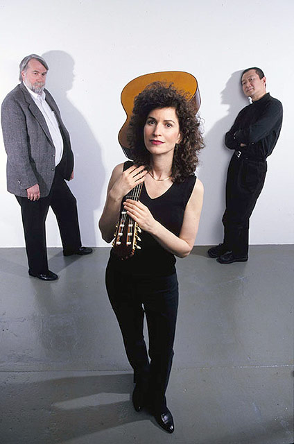 Sharon Isbin with Christopher Rouse and Tan Dun. Photo by Steve Sherman. |